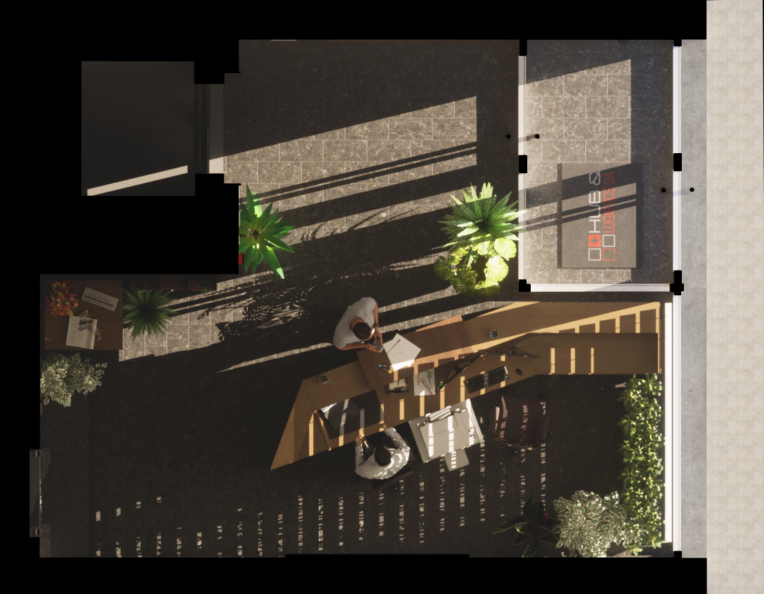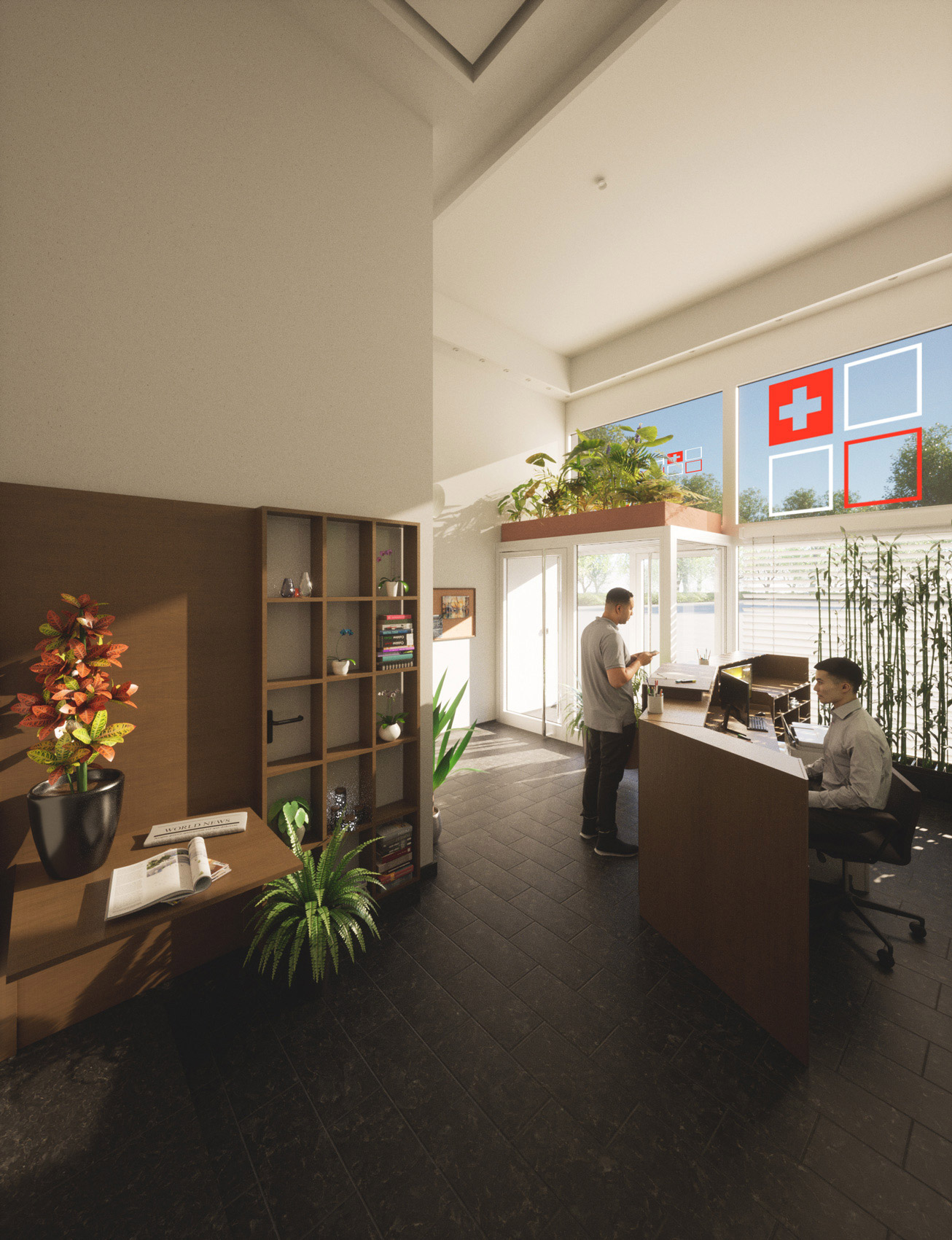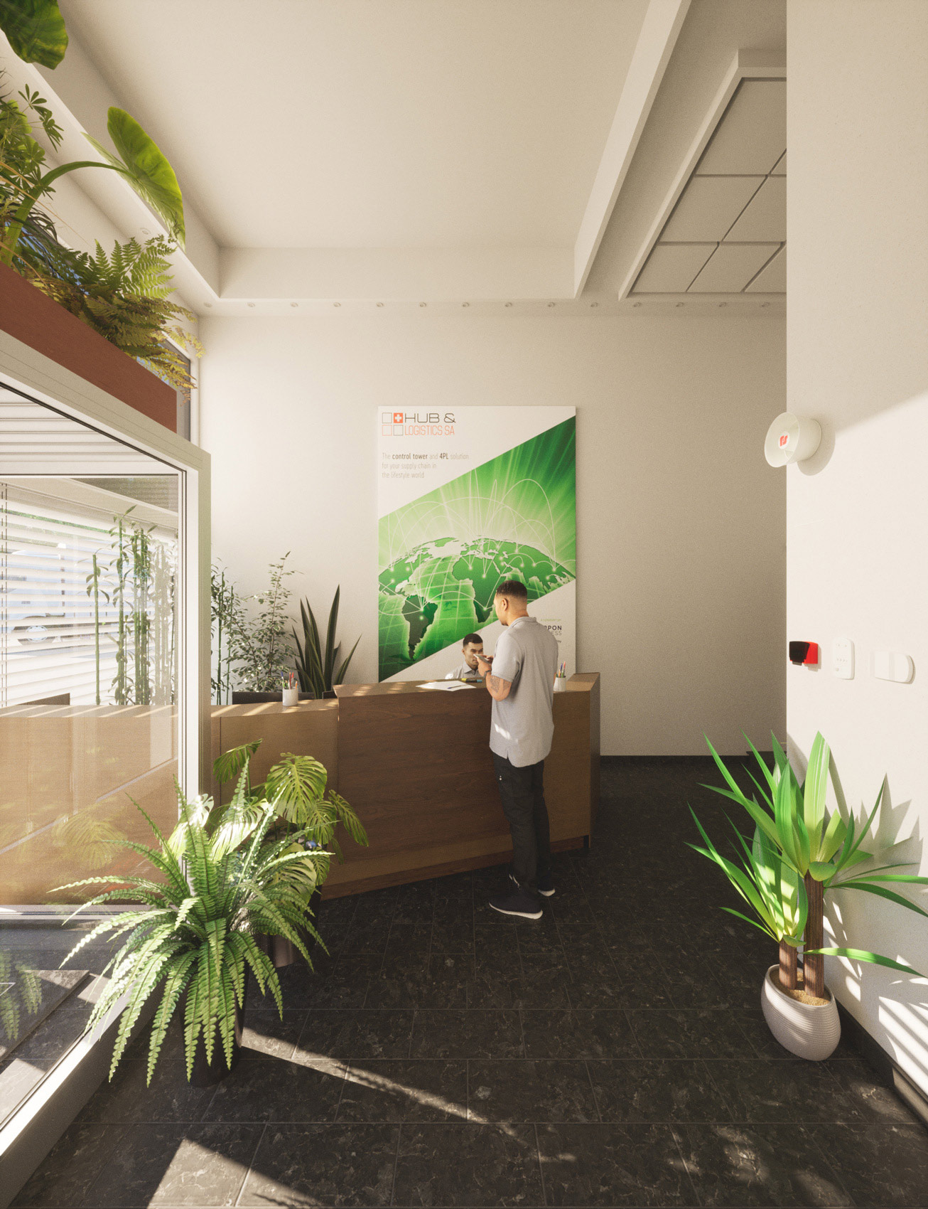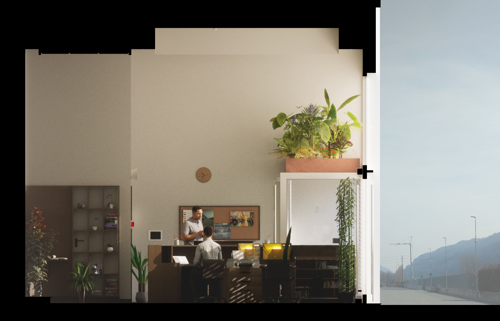 Il progetto presenta la sfida di ringiovanire uno spazio ampiamente usurato e senza carattere. L'azienda ha richiesto uno spazio d'ingresso che potesse rappresentarlo ai clienti e agli ospiti. Dal momento che non è stato possibile modificare la struttura interna, completamente portante, furono necessari dei giochi compositivi. Il tutto garantendo il comfort per i dipendenti e l’accesso alle vie di fuga e ai locali tecnici.